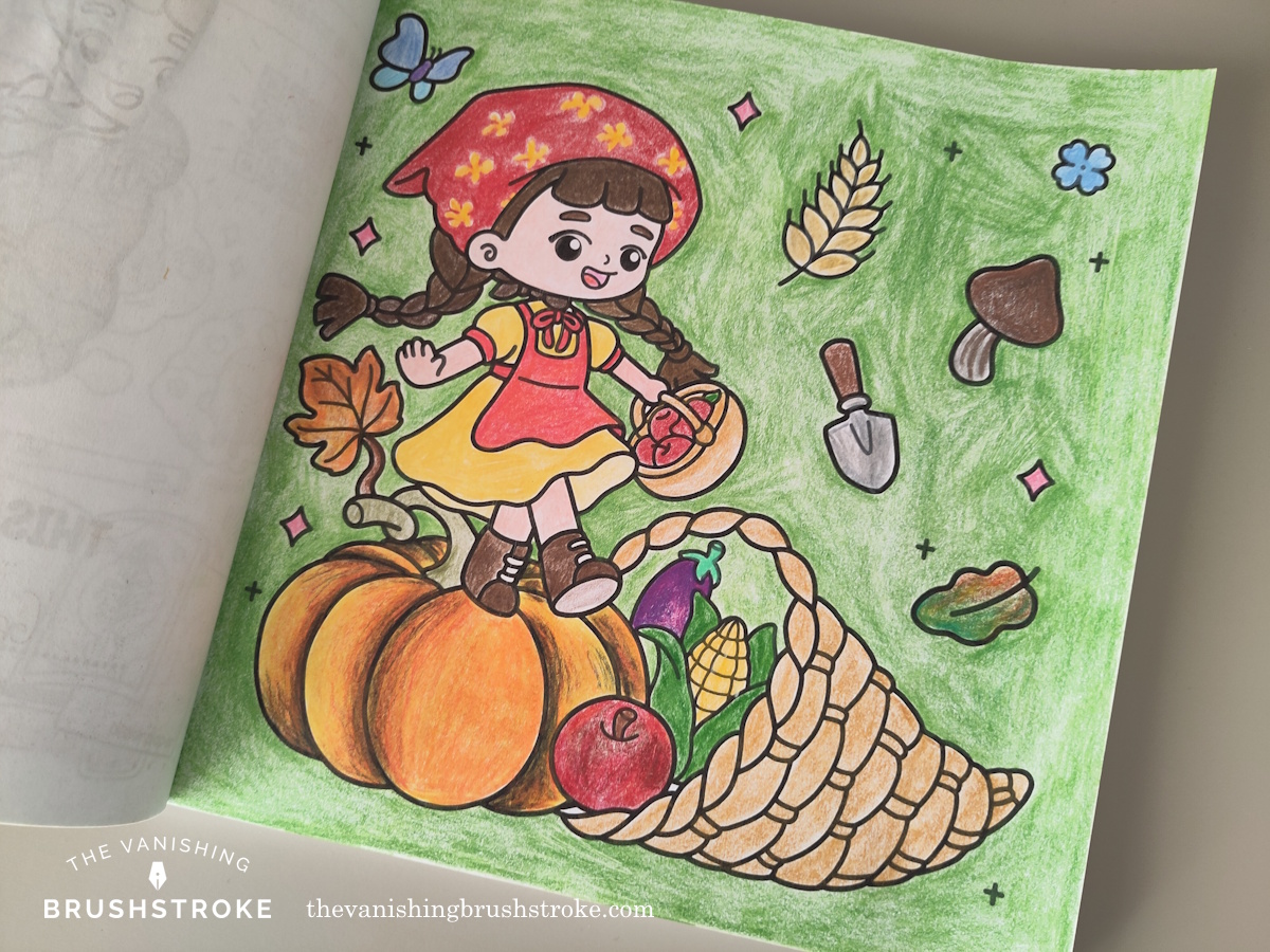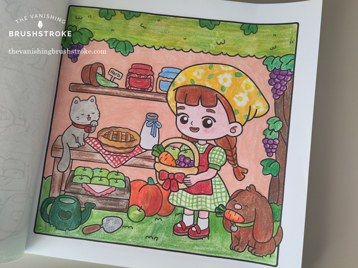 I enjoy the fact that I do have creative freedom when colouring these pages. For instance, above I chose to give her a green gingham dress and I also made the napkin under the baked pie a gingham one. As you guessed, I love gingham patterns. It forces my brain to also figure combinations of colours that won’t look too off next to one another. I’m sure my mind must be learning something somehow even if I do not set out to learn anything here.