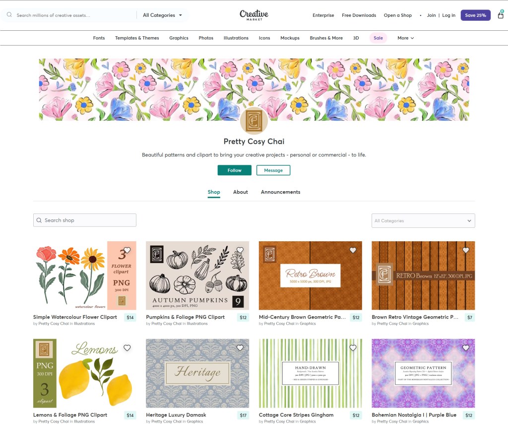 My Creative Market shop features high‑quality non‑seamless digital papers, seamless repeating patterns, and PNG clipart designed for creators who want polished, ready‑to‑use assets for branding, printables, product design, and digital projects.